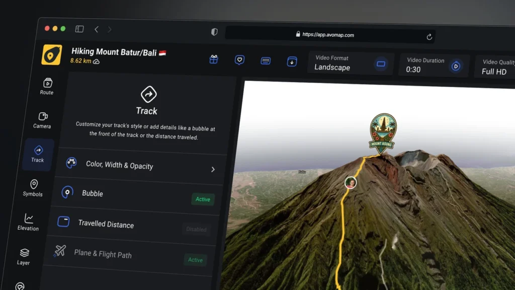 Your map isn’t just a line—it’s a story. AvoMap creates smooth, flyover animations that bring each trip to life, with previews available before you export.