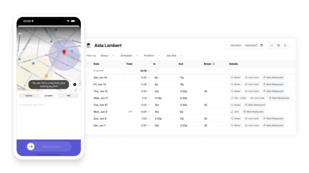 Staff can clock in with GPS, selfie, Wi-Fi, or a PIN. It prevents time fraud and logs hours in real time. The app turns this data into timesheets you can export for payroll.