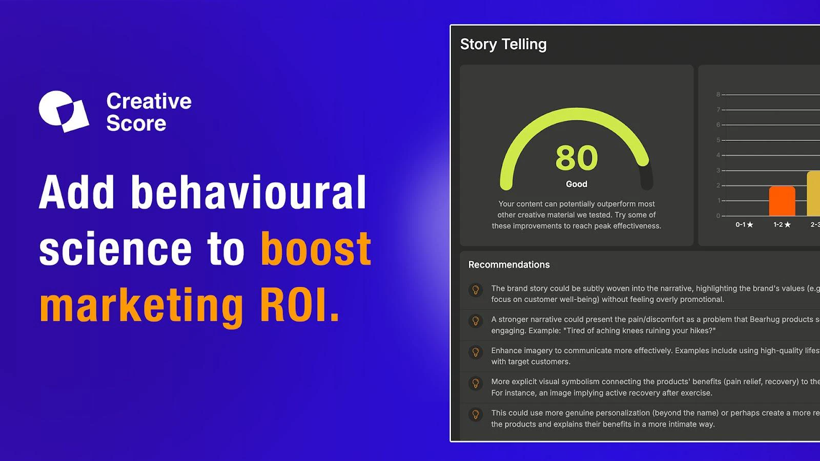 Creative Score uses behavioral science to check headlines, images, and storytelling. It gives a percentage score showing how well your design might perform. You can improve weak points before spending on ads.