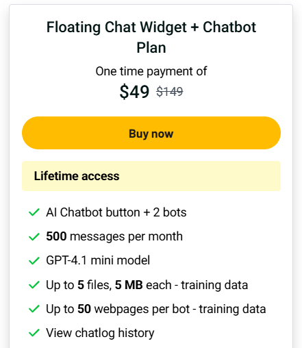 I tested GetButton on a small business site, and it impressed me with its ease of use. The setup was quick—no coding needed—and the chatbot replies felt natural and relevant. It saved a lot of time answering repetitive questions, and the integration with WhatsApp and Messenger was a big plus for customers. While the monthly message limit might be tight for bigger sites, it’s great value at a one-time $49 price. For businesses wanting affordable, AI-powered support, GetButton is a solid choice.