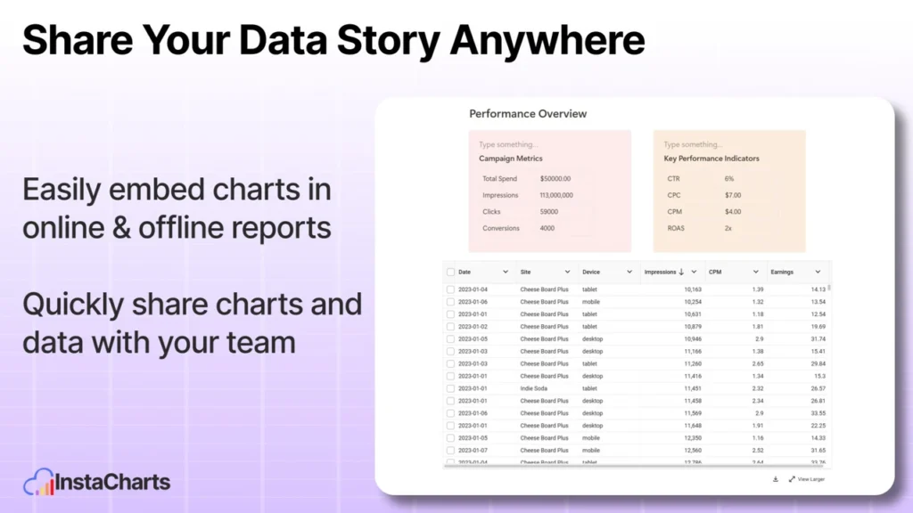 If you work with spreadsheets, InstaCharts can save you time. It turns your data into clean, simple charts in just a few clicks. You don’t need to know code or design. Just upload your file and let InstaCharts do the rest.