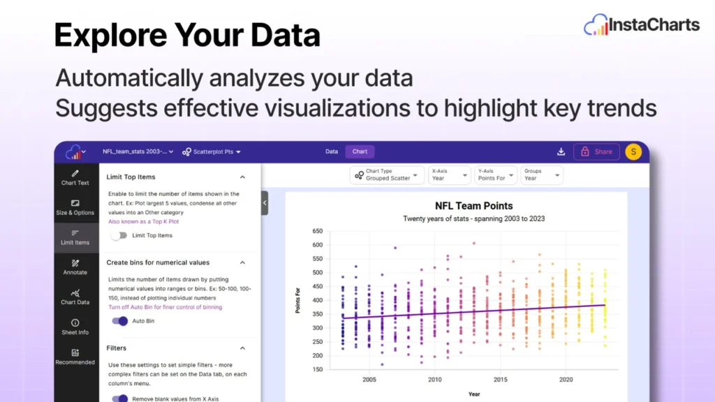Not sure which chart fits best? InstaCharts picks the right chart to show your trends and patterns clearly.