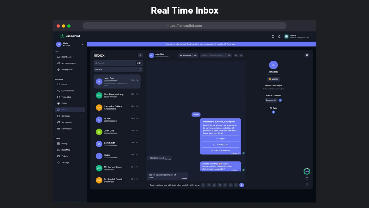 Lancepilot is a tool that helps you send WhatsApp messages to leads and customers. It works in real time and follows Meta’s rules, so your messages stay safe and legal. If email marketing isn’t working for you, Lancepilot gives you a better way to reach people directly.