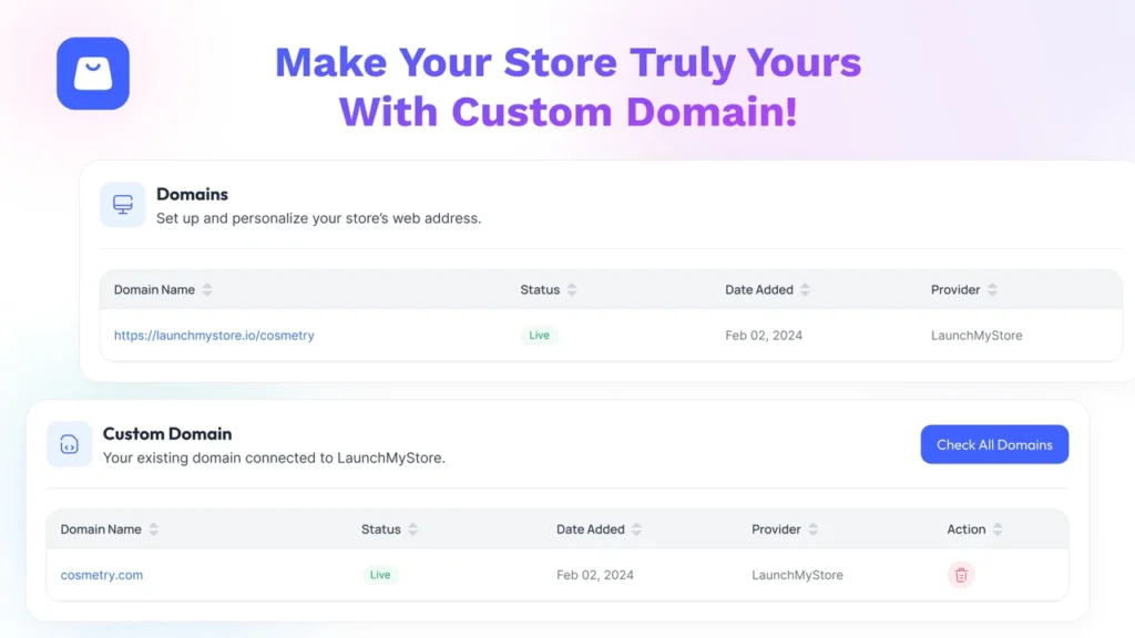 Use your own domain name to look more professional. It’s quick to connect and helps customers trust your brand.