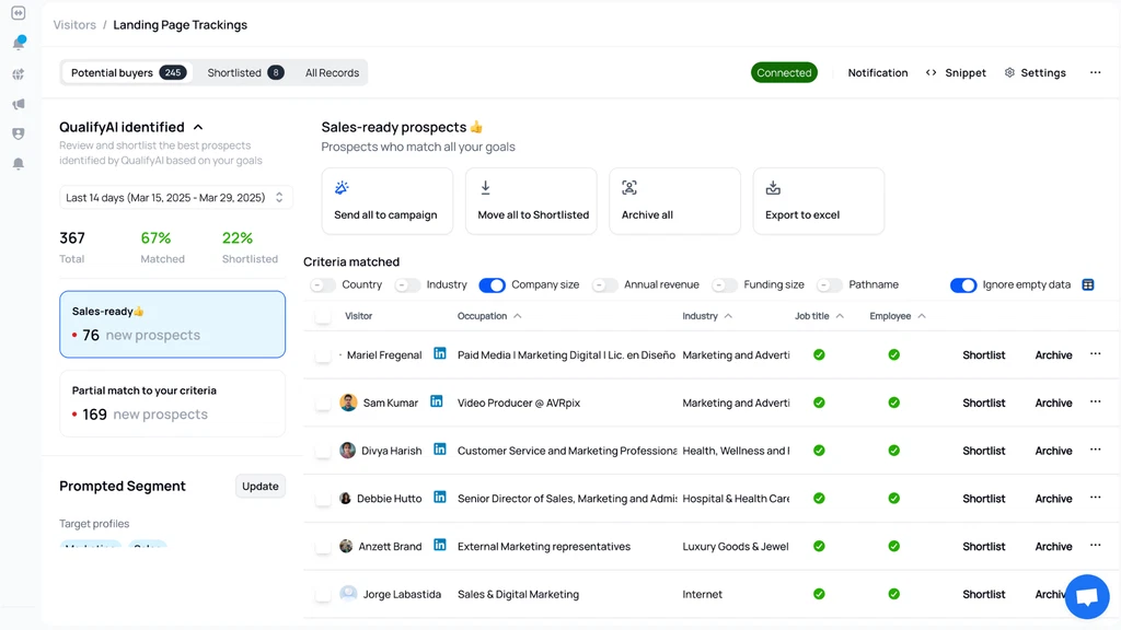 The AI finds important info like email addresses, job titles, and LinkedIn profiles. You can filter by job role, company size, or industry. This helps you focus only on high-quality leads.