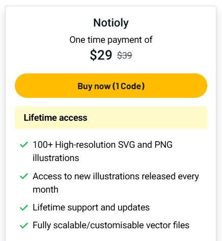 I tried Notioly and liked how easy it is to use. The SVG files work well with Adobe Illustrator and Figma. Changing colors and sizes is quick and smooth. The monthly updates keep the collection fresh and useful. If you know basic design tools, this product will save you time. It’s a good deal for its price and the lifetime access. Beginners might need some time to learn how to edit SVGs well. Overall, Notioly is a useful tool for anyone who wants clean and modern illustrations fast.