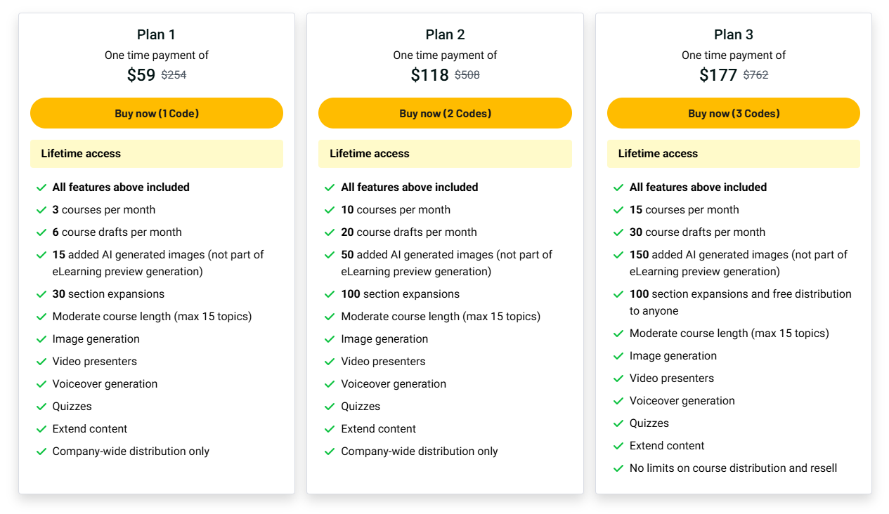 | One-time payment, lifetime use | Lower plans limit course sharing |