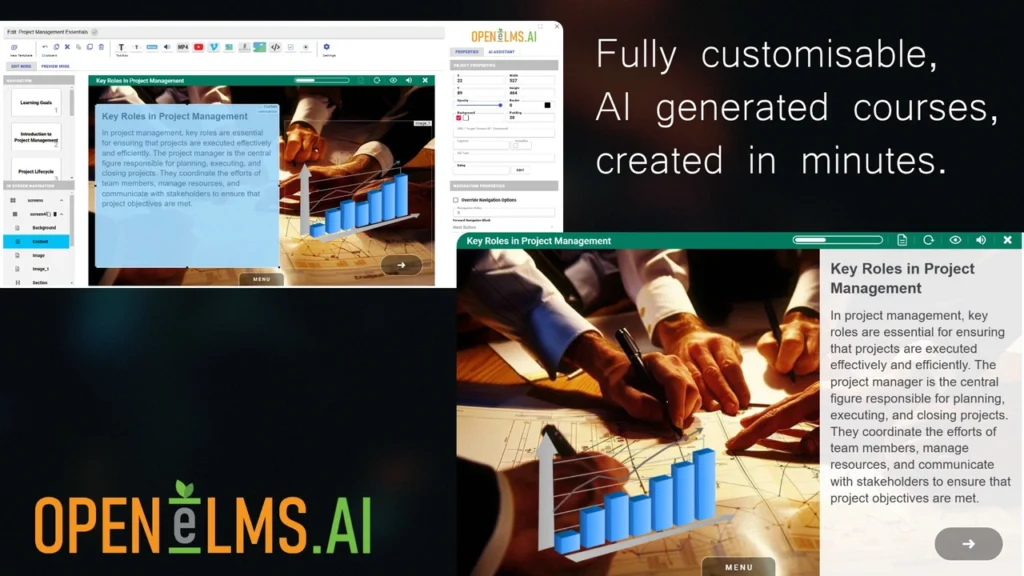 Open eLMS reads your text and builds a course automatically. It adds pictures, videos, and animations to make the course look great.