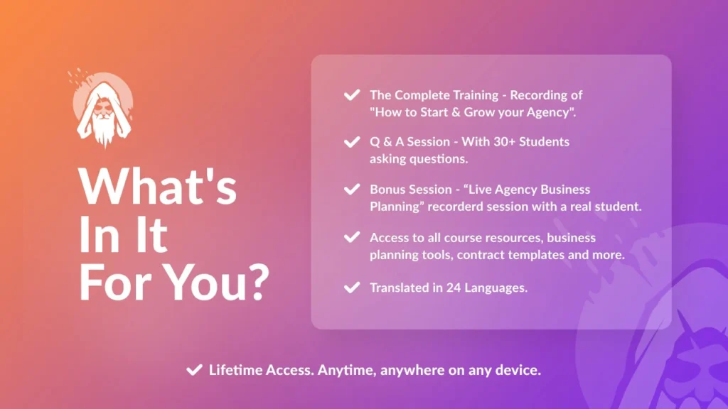 The course includes a 5-hour video recording covering every aspect of building an agency. From defining services to closing clients, it’s designed to save you years of trial and error.