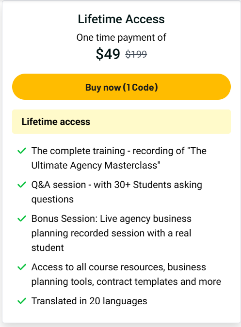 This masterclass is perfect for those wanting a structured, real-world roadmap to agency success. With actionable strategies, expert guidance, and lifetime resources, it’s a comprehensive solution to start and grow your business.