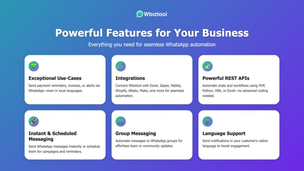 If you’re more technical or work with a developer, the REST API lets you connect WbizTool with your CRM or booking app. Automate messages based on triggers like new bookings or payment updates.