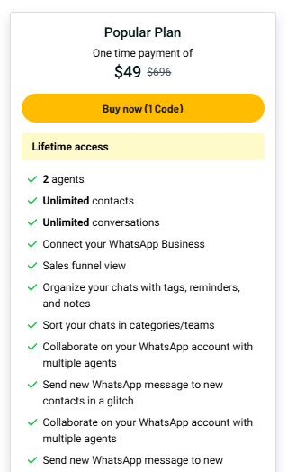 The funnel view is my favorite part. I could move chats through steps and see which leads were hot. Auto-replies helped cut down our response time. It’s not perfect—some features need a monthly plan—but for $49, it’s a steal.