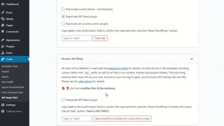 WP Reset can reset your whole website back to how it was when you first installed WordPress. You don’t need to reinstall anything by hand. It’s quick and saves lots of time.